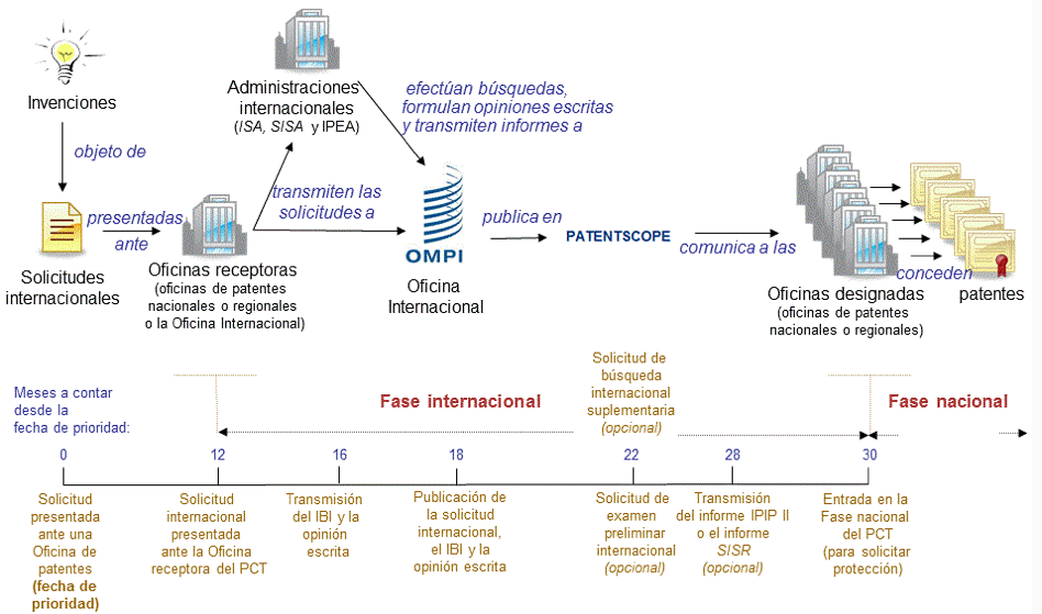 - Presentación de la solicitud internacional ante una Oficina nacional o regional de patentes, o ante la Organización Mundial de Propiedad Intelectual – OMPI.